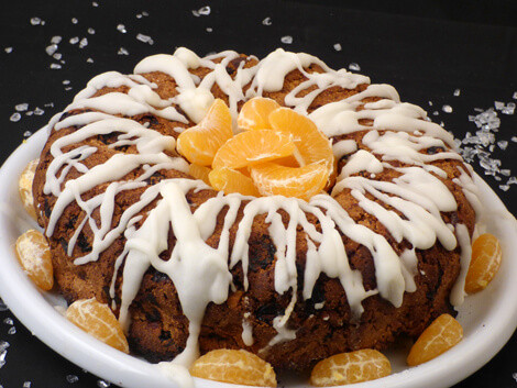 7. Hűlés után készítsük el a cukoroldatot: daráljuk meg az eritritolt és kezdjünk hozzá nagyon óvatosan narancslevet adni. Hozzunk létre egy sűrű, túltelített oldatot, ezt csurgassuk a sütemény tetejére.