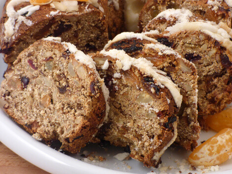 A képen látható nem hagyományos gyümölcskenyér, nem tojással készült - de azzal is elkészíthető - mást viszont nem hagytunk ki belőle.