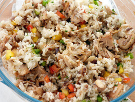 3. A hagymákat szeleteljük apróra és az olajon pirítsuk meg, adjuk hozzá az aprózott fokhagymát, a fűszereket, a misot, a folyékony füstöt. Kevergessük együtt ezeket 1-2 percig, amikor elfővi a levét, dobjuk bele a jackfruitot és pirítsuk kissé le. Öntsük fel kevés vízzel és a vizet pótolgatva, főzzük 20 percig. A legvégén várjuk meg, amíg teljesen elfő a leve és pirítsuk le.4. Keverjük össze a rizst és a kész jackfruitot.