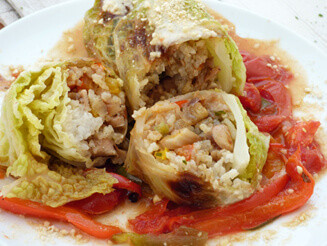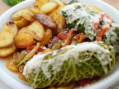 Nemrégiben készítettünk egy rakott kelt jackfruittal és azt tapasztaltuk, hogy a jackfruit és a kel nagyon finom együtt, egymás ízét erősítik, kiegészítik. Ezen felbuzdulva, ma egy töltött káposztaételt készítettünk belőle. A megtöltött kelleveleket kaliforniai paprikából készített lecsós alapra helyeztük, zabtejföllel meglocsoltuk, vegán magparmezánnal megszórtuk. Még a királyok is megnyalták volna mind 10 ujjukat utána. Akik szeretik a kelt, nagyon elégedettek lesznek ezzel az étellel. Könnyű, ízekben gazdag, egészséges. A kel jótékony hatásairól rengeteg cikk jelent meg mostanában az interneten, a brokkolival, karfiollal, káposztákkal együtt a legegészségesebb táplálékok közé sorolják a kutatások. Ilyenkor ősszel jelennek meg a nyáron érett, egészséges, harsogóan zöld példányok. Bónuszként nem is drága zöldség. A jackfruit sem drága, egy konzervnyi jackfruit négy ember ételéhez elegendő. A lecsó nem