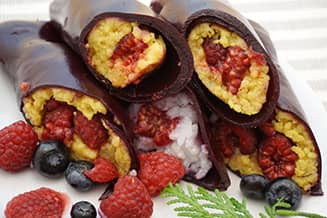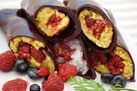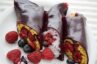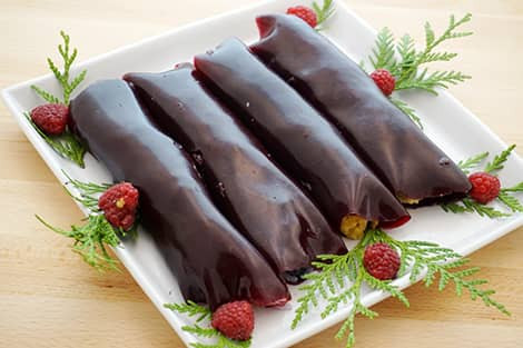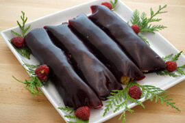 Az alábbi édesség „kabátját” tulajdonképpen bármelyik idénygyümölcsből el lehet készíteni, mi most áfonyát használtunk. A gyümölcsbőr készítéséhez az élénk színű gyümölcsök a legjobbak, igen látványos, ragyogó színű bőrök készülhetnek szederből, ribizliből, málnából, sárgabarackból, eperből is. A gyümölcsöket ebben az ételben megfőztük, a gyümölcsbőrt nem aszalással készítettük, így a gyorsabb és egyszerűbb, és azok is könnyedén boldogulhatnak vele, akiknek nincs aszalógépük.