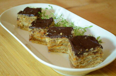 6. A második lapot papírral fölfelé fordítsuk rá a lekváros diós felületre. A papírt húzzuk le róla és újra lekvár és dió következik. Így járjunk el a következő lappal is.