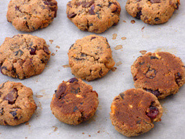 3. FONTOS: 180 fokos sütőben összesen 10 percig sütjük, de a 9. percnél már elkezdünk gyanakodni és figyelni. Nem szabad megvárni, amíg a kekszek elszíneződnek/megbarnulnak. A kekszek akkor tekinthetők sültnek, ha a talpuk megbarnul egy kicsit (lásd a képet). Nem kell aggódnunk, hogy a kekszek nem lesznek elég sültek, hiszen a benne lévő hozzávalók lényegében nyersen is ehetők.