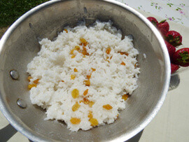 4. A rizst és a tojássárgáját összekeverjük, beledobjuk a megmosott mazsolát is.