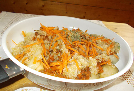 4. Egy nagyobb serpenyőben keverjük össze a megfőtt quinoát és a párolt zöldségeket.