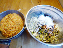 Maradék vörös lencséből is elkészíthető. Az elkészítéséhez használtunk még csíráztatott mungóbabot is, de természetesen a főtt mungóbab is jó. Mi mindig tartunk csíráztatott mungóbabot a hűtőben, a reggeli kásákat éppúgy meghinthetjük vele, mint a salátákat, friss, egészséges csíra, tele van élettel.