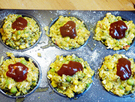 5. A burgersütő formánk mélyedéseit olajozzuk ki egy kicsit és osszuk el bennük a masszát. Tegyünk mindegyik tetejére egy-egy kanál BBQ szószt. Amikor a kész burgereket a sütőből kifordítjuk a BBQ szósz alulra fog kerülni, de sebaj, díszítsük a felülre kerülő felületét is szósszal, növényi tejszínnel.