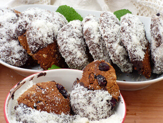 Mi aszalt áfonyával és kókuszreszelékkel is gazdagítottuk a tésztát, de áfonya helyett tehettek bele más, aprózott, aszalt gyümölcsöt is, esetleg dió és magfélét is. Tényleg nagyon különleges és finom. A kisült kekszeket kicsit kisminkeltük, hogy ne csak finomak, hanem mutatósak is legyenek, egyik felüket olvasztott csokoládéba, majd kávédarálóban kissé megőrölt kókuszreszelékbe mártottuk. A smink jól áll ugyan a kekszeknek, kicsit ünneplősebbé teszi őket, de a kekszek e nélkül a szépítés nélkül is finomak, strapabíróak, hurcolhatók, omlósak és ropogósak is egyszerre.